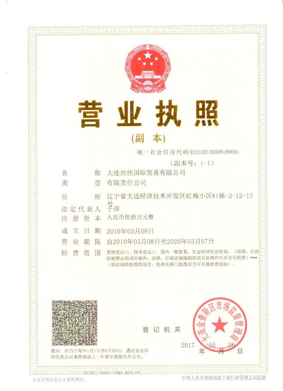 大連世佳國際貿易有限公司,是一家大型綜合性國際貿易公司,世佳貿易擁有國際最先進的生產和檢測設備,不斷開發新產品,以迎合市場需求, 公司秉承“質量是企業的生命, 您的滿意是我們的追求”的經營理念,堅持“客戶第一”的原則為廣大客戶提供優質的服務。